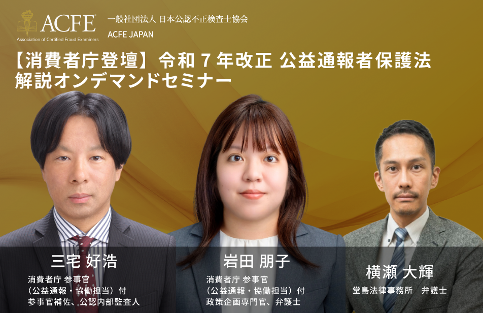 | セミナー内容 | 2025年のACFE JAPANプレカンファレンスにおいて、消費者庁三宅 好浩 氏・岩田 朋子 氏よりご講演いただいた「令和7年公益通報者保護法改正の概要」は、多くの参加者から高い評価をいただきました。 参加者アンケートでは、 •「制度の理解が深まった」「改正内容が明確に整理された」 •「フリーランスの保護拡大や立証責任転換が印象的だった」 •「内部通報制度運用への実務的示唆を得た」 など、理解促進に大きく寄与したとの声が多数寄せられました。 一方で、 「より具体的な事例・実務対応を知りたい」「立法趣旨の背景をもう少し深く理解したい」という要望も多く寄せられたことから、今回はプレカンファレンス講演の理解深化型ウェビナーとして再構成し、また、実務解説に堂島法律事務所弁護士横瀬 大輝氏をお迎えし、企業実務者の皆様に向けて改正法対応の実践的ヒントを提供致します。 <講師> 三宅 好浩 氏 (消費者庁 参事官(公益通報・協働担当)付 参事官補佐、公認内部監査人) 岩田 朋子 氏 (消費者庁 参事官(公益通報・協働担当)付 政策企画専門官、弁護士) 横瀬 大輝 氏 (堂島法律事務所 弁護士) |