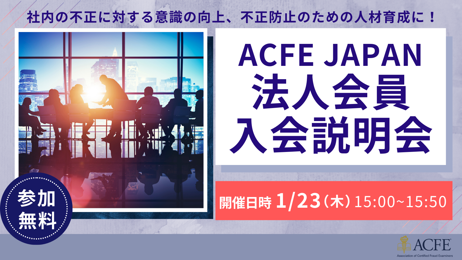 | セミナー内容 | ・社内での不正対策を進めたい ・社内の不正に対する意識を高めたい ・不正チェックできる人材を育てたい ・社内にCFE資格取得者を配置したい そんな企業様、ご担当者の方に! 社内での不正に対する意識を高めるには? ACFE JAPANの法人会員制度とはどんなものなのか? しっかりご説明いたします。 <法人会員入会説明会 内容> 1. ACFE本部及びACFEJAPAN協会概要説明 2. 不正リスク管理は全員参加の理論的理由 3. 不正リスク管理は全員参加の現実的理由 4. 全員参加を怠ると、起こる悲劇とは!? 5. ACFE JAPAN 法人会員制度のご紹介 6. 補足:個人会員と法人会員の金額比較 7. 補足:CFE/公認不正検査士とは |